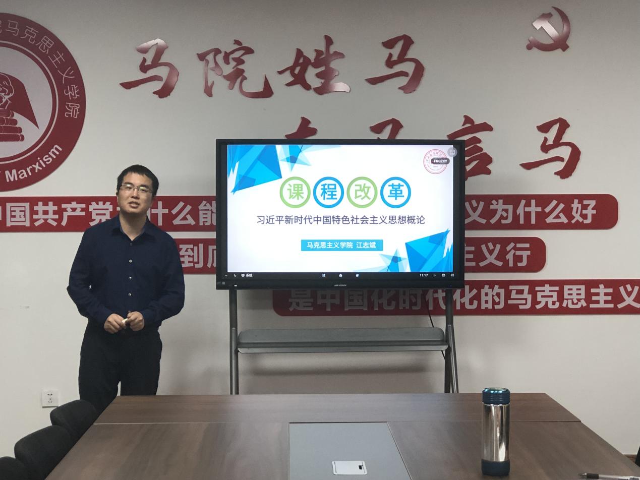 随后,江志斌老师围绕《习近平新时代中国特色社会主义思想概论》这一门课程,主要从课程的目的与任务、教学内容、学情分析、教学思想与理念、教学方式与方法等方面进行说课汇报。首先,明确课程的性质、定位以及课程的目标;之后,对其授课的班级进行较为详细的学情分析,从学生的基础知识、学习态度、学习能力这三个方面着手分析;最后,重点强调了课改的思路,基于OBE教学理念,坚持线上线下混合式教学,以任务驱动法和项目式教学为主,坚持以学生为主体、教师为主导的原则,坚持问题导向的原则,将思政课程融入专业课,深入去挖掘新的思政课程元素。