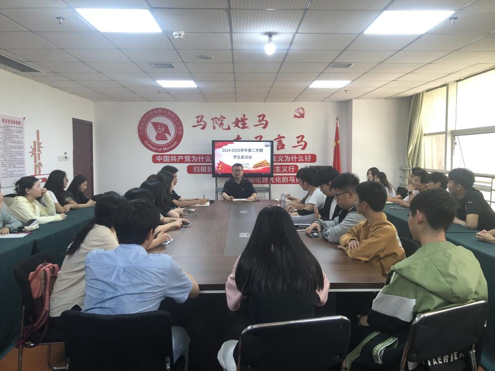 2025年4月18日,马克思主义学院在综合楼807召开了学生座谈会。本次座谈会旨在倾听同学们的心声,了解大家在学习、生活中的实际需求与困难。学院始终秉持“以学生为中心”的理念,希望通过这样的面对面交流,为大家搭建一个畅所欲言的平台,共同探讨如何优化学习环境、提升服务。学院教研室主任胡杏根老师,以及来自不同年级、不同专业的学生代表参加了此次会议。