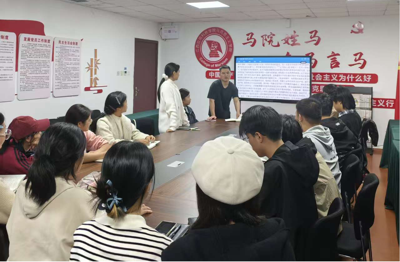 为深入学习马克思主义经典著作,进一步提高社员的理论素养和思想觉悟,2025年10月31日晚,江西应用科技学院青马读书社于综合楼807会议室举办了第四期读书会,围绕《德意志意识形态》开展了专题学习与交流活动。此次活动由青马社指导老师海小云领读,全体社员共同参与。