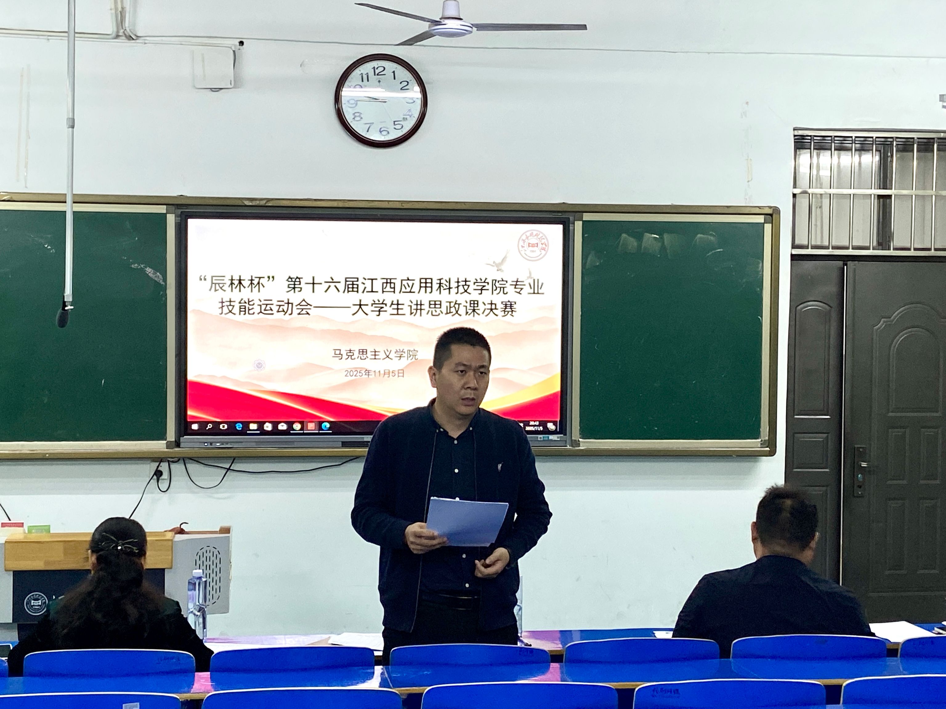2025年11月5日晚18:30,“辰林杯”第十六届江西应用科技学院专业技能运动会——“大学生讲思政课”比赛决赛在三达楼阶梯7教室隆重举行。本次比赛由马克思主义学院主办,经过半决赛的激烈角逐,脱颖而出的选手们再次登台,围绕“五四精神”“戊戌变法”“绿水青山就是金山银山”“长征精神”“改革开放”等多个思政主题展开了精彩的讲授。