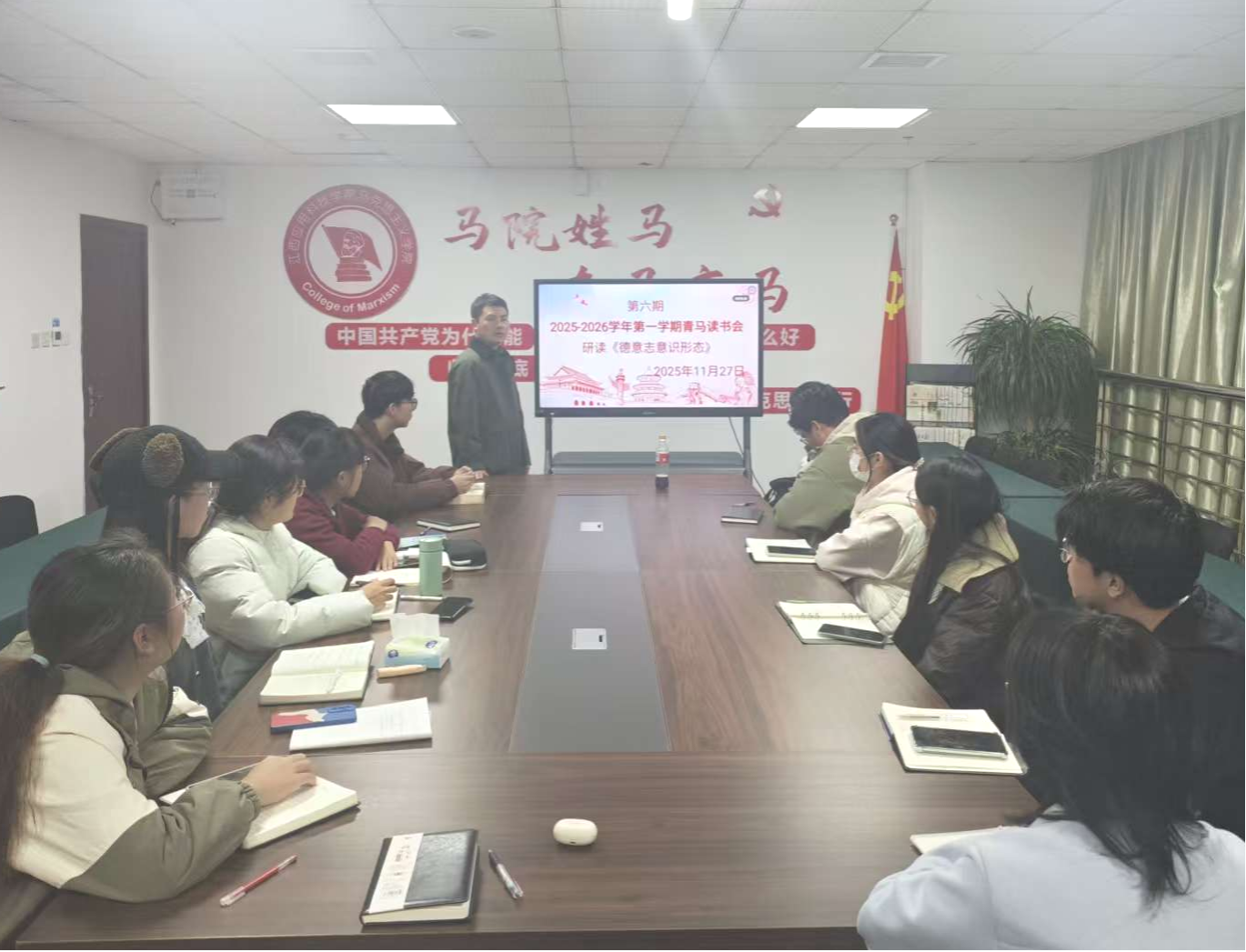 为深化对马克思主义理论的理解,提升社员理论素养与思想觉悟,2025年11月27日19:00—21:00,江西应用科技学院青马读书社在综合楼807会议室成功举办第六期读书会。本次活动以学习马克思主义经典著作《德意志意识形态》为主题,由指导老师海小云领读,全体社员共同参与。