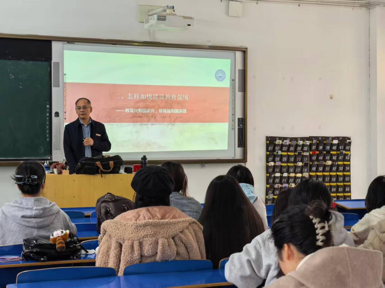 2025年 11 月5日,我校党委委员、副校长谢远健教授以“教育筑基、科技赋能、人才强国——新时代青年的责任与担当”为题,为我校23本物流管理1班同学讲授了一堂立意高远、内涵丰富的思政课。课堂上,谢远健教授结合高校育人使命与行业发展实践,深刻阐释教育科技人才一体化的战略意义,引发全场学子热烈反响。