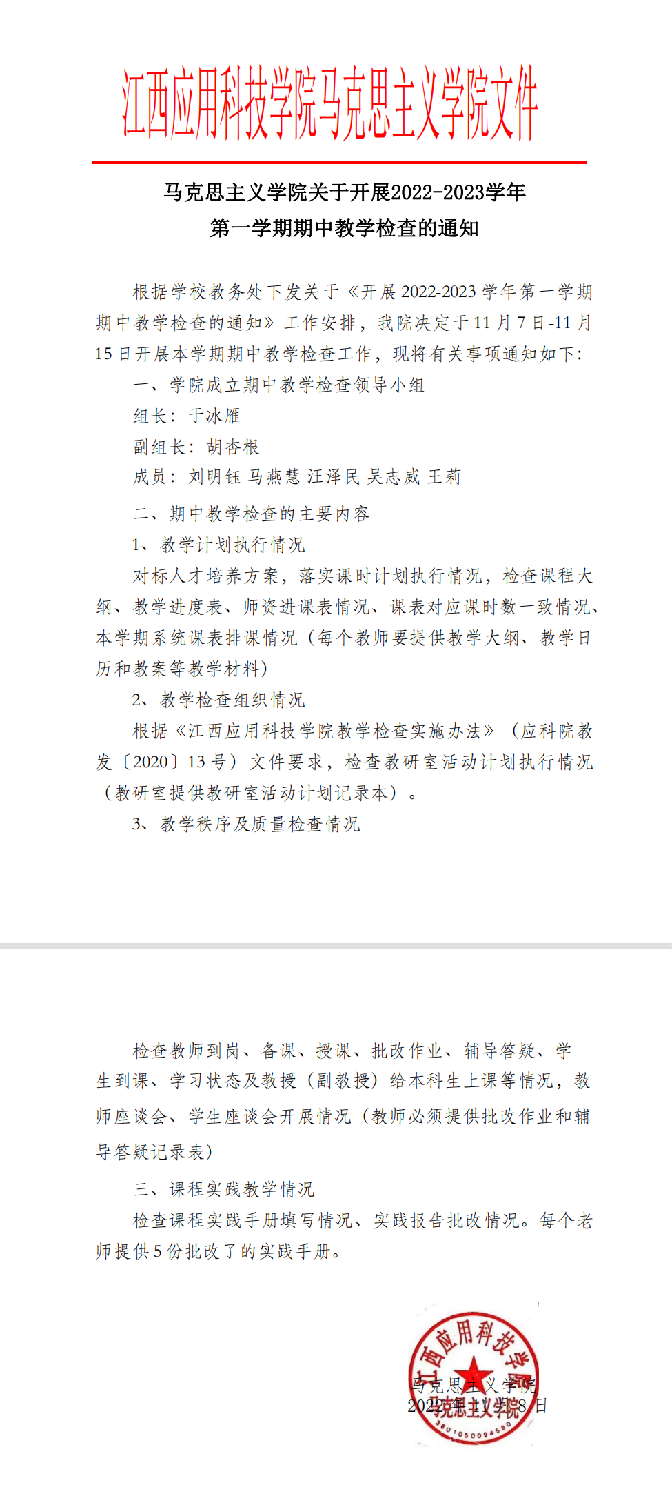 马克思主义学院关于开展2022-2023学年第一学期期中教学检查的通知