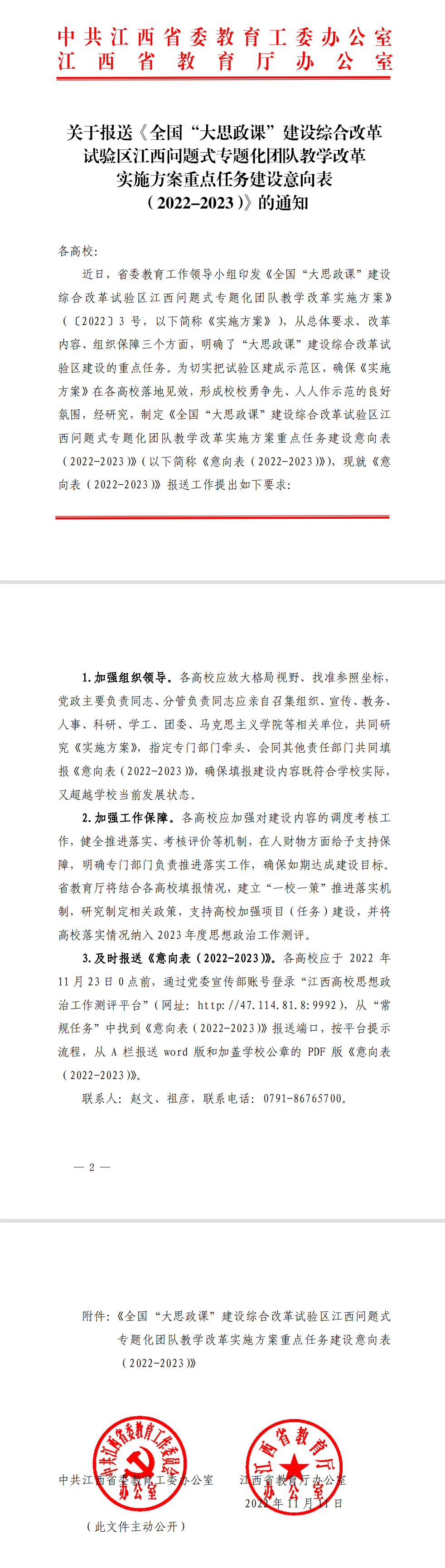 党办 无文号 关于报送《全国“大思政课”建设综合改革试验区江西问题式专题化团队教学改革实施方案重点任务建设意向表(2022-2023)》的通知(1).pdf