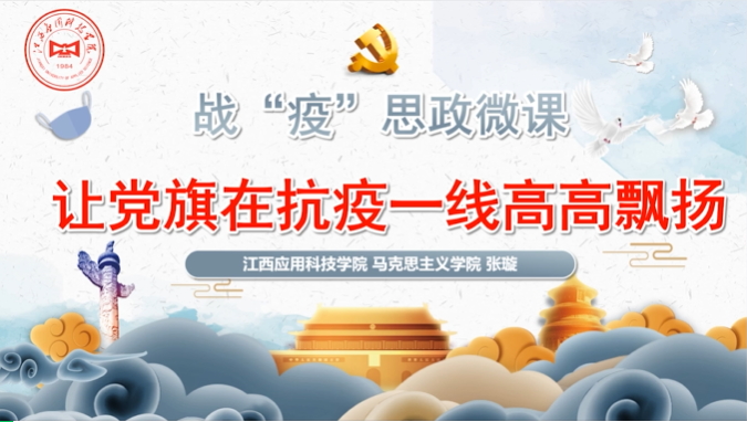 为切实加强疫情防控期间大学生思想引领和政治教育,并落实学校“停课停学不停教”总体要求,近日,江西应用科技学院思政课教师成立了战“疫”思政微课宣讲团,在既定课程内容的基础上,专题策划了战“疫”思政微课,及时将疫情防控内容贯穿融入教学,坚持化危为机、抓住契机,肩负起观察时代、解释时代、引领时代的担当,积极发挥好思政课强信心、暖人心、聚民心的作用。