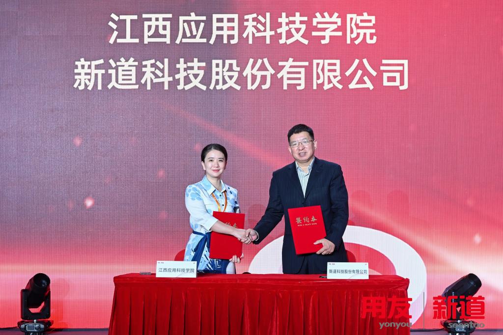 为了表彰在数智化人才培养产教融合、校企合作工作中取得突出成果的单位和个人,8月13日,由用友网络、新道科技,多鲸联合主办的第十二届数智化人才培养产教融合发展大会教育之夜暨颁奖盛典隆重举行。江西应用科技学院获评2022年数智产业学院奖。常务副校长干甜在会上代表学校与新道科技股份有限公司签署《共建用友新道数字财经产业学院合作协议书》。