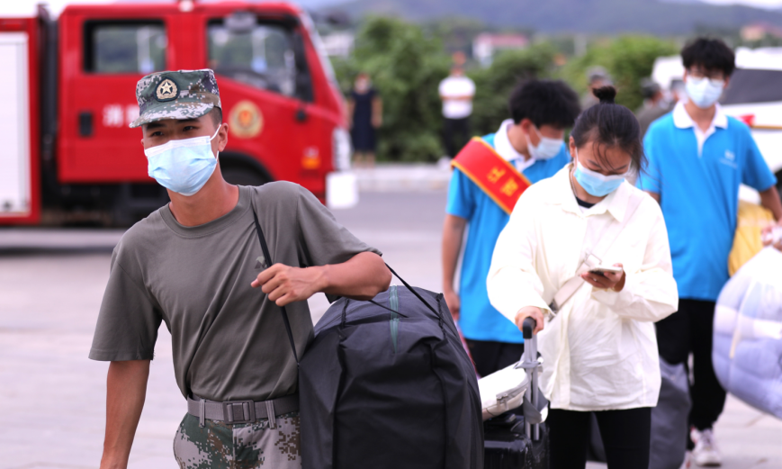 为迎接新生的到来,学校在严格落实疫情防控要求、保障师生健康安全的基础上提供了细致的入学服务。在南昌站及南昌西站等站点分别设立了新生接待处,为到站的新生提供热情指引及帮助。根据疫情防控要求,学校在大门口设立了新生入学通道,通道内分别设置了健康码和核酸报告检查区、测温区和接送区。“同学,麻烦间隔1米排队,戴好口罩”“请打开手机出示健康码和行程码,测量体温。”教官队队员们在通道处不停地忙碌着,负责体温检测、人员指引、协助查验等工作。此外,志愿者团队的身影也活跃在校园各处,他们在道路指引、答疑解惑、行李搬运等方面给予新生热情帮助。