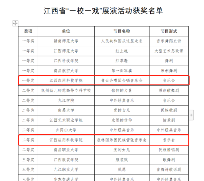 1月12日,江西省教育厅公布江西省“一校一戏”展演活动获奖名单,我校在此次活动中喜获佳绩。其中,音乐会《青云合唱团合唱音乐会》荣获一等奖、《辰林国乐团民族管弦音乐会》荣获二等奖。