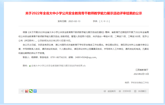 近日,由江西省教育厅举办的2022全省大中小学公共安全教育骨干教师教学能力展示活动结果出炉,共评选出一等奖41项、二等奖71项、三等奖100项。其中,我校国际商务学院教师在此次大赛中荣获二等奖。