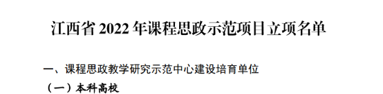 近日,江西省教育厅公布了2022年江西省课程思政示范项目认定结果,我校获评省级课程思政教学研究示范中心建设培育单位,标志着我校课程思政建设工作迈上了新台阶。