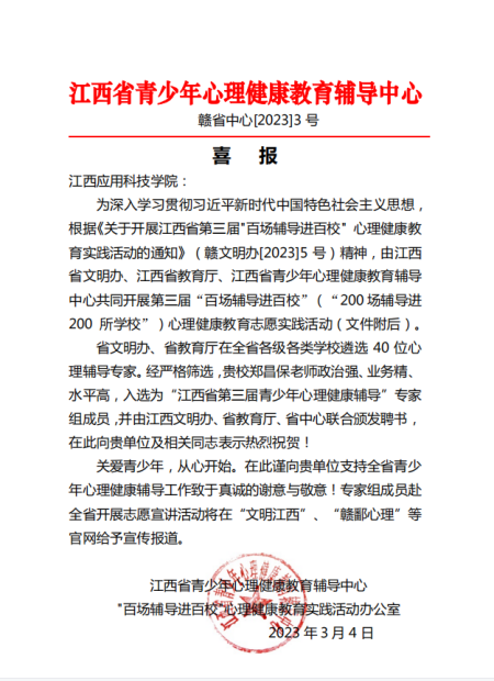 近日,在江西省文明办、江西省教育厅、江西省青少年心理健康教育辅导中心共同开展的江西省“百场辅导进百校”心理健康教育志愿实践活动中,我校郑昌保老师成功入选为“江西省第三届青少年心理健康辅导”专家组成员。