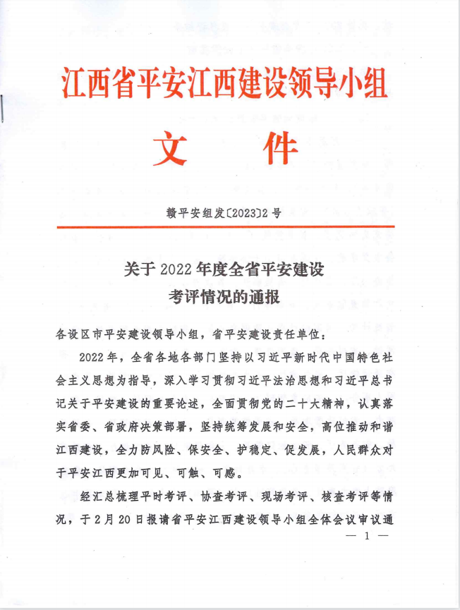 近日,江西省平安江西建设领导小组印发《关于2022年度全省平安建设考评情况的通报》,我校被评为“2022年度全省平安建设工作先进单位”。这是我校自2020年以来,连续三年获此殊荣。
