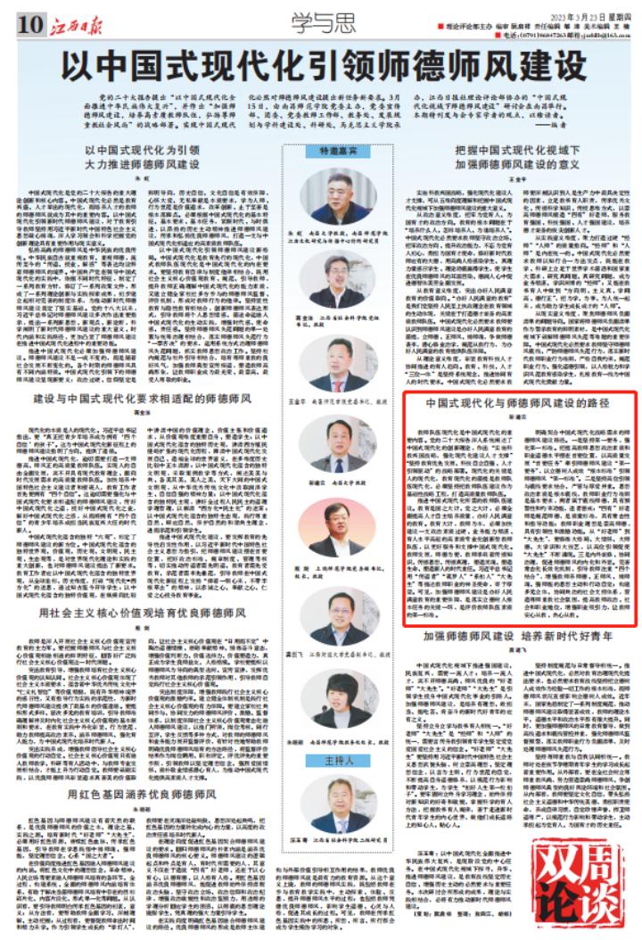 3月15日,“中国式现代化视域下师德师风建设”研讨会在南昌举行。学校党委书记彭迪云应邀出席,辰林教育集团首席战略官汪玉奇主持研讨会。3月23日,《江西日报》“学与思”理论版以《以中国式现代化引领师德师风建设》为题,刊发“中国式现代化视域下师德师风建设”研讨会学者观点,这些正是我校“教师养德修为工程”的重要指引。现摘录如下: