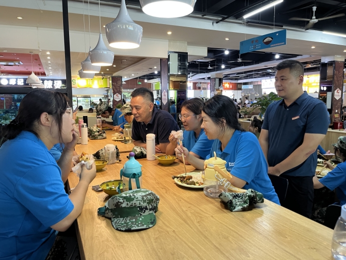 在食堂用餐区,江作军和同学一起用餐并亲切交流。“同学们都是来自哪里?”“习惯江西的口味吗?”“饭菜的价格贵不贵?”“喜欢辣一点还是清淡一点?”了解学生在学校的生活学习心理等情况。江作军希望大家以校为家,有什么问题及时向学校反映,有什么好创意可以向学校提出,学校将全力打造一个安全温馨的学习生活环境,让大家快乐成长,学有所得。