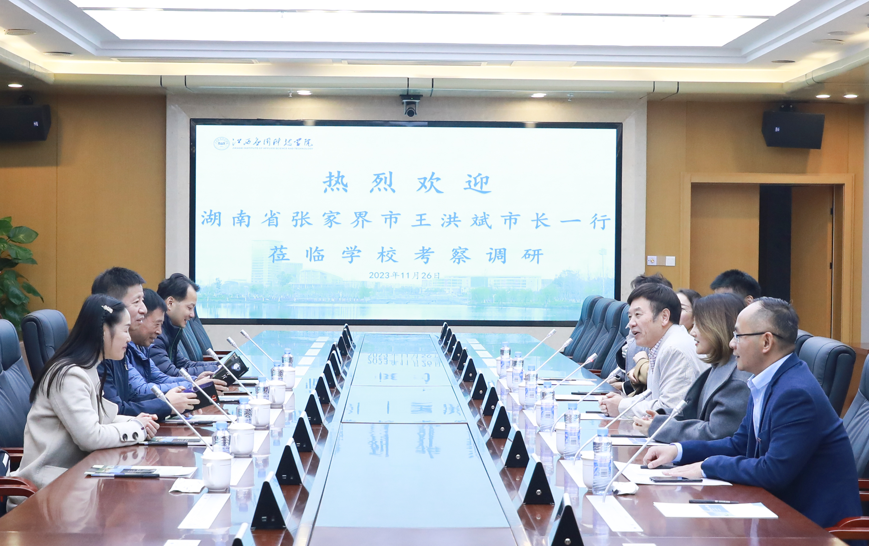 随后,双方在三元大厦一楼会议室举行座谈。王洪斌对我校的热情接待表示感谢。他结合政策机遇、区域优势、生态优势、文化优势、产业技术优势等详细介绍了张家界的发展概况。王洪斌表示,江西应用科技学院在产教融合、学科建设、服务地方等方面有着较为丰富的经验,诚挚邀请学校到张家界投资兴业,共谋发展。