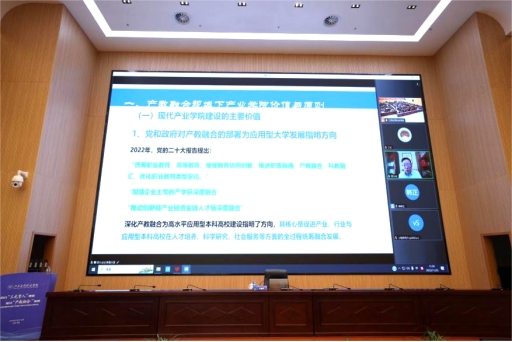 顾永安主要从产教融合视域下产业学院建设价值原则、主要问题、推进思路、解读启示四个方面作报告。他表示,应用型大学应贯彻党和政府对产教融合的指导部署,实现产教、科教、校教融合发展,坚持育人为本,对焦服务产业,深化融合发展,落实共建共赢。