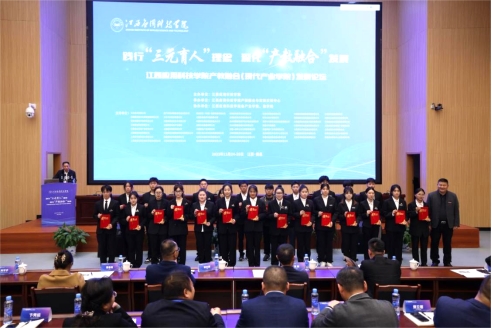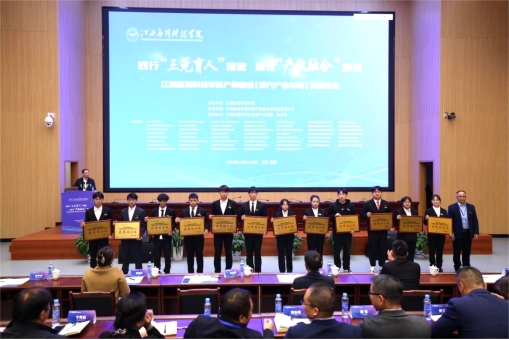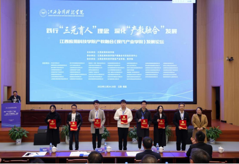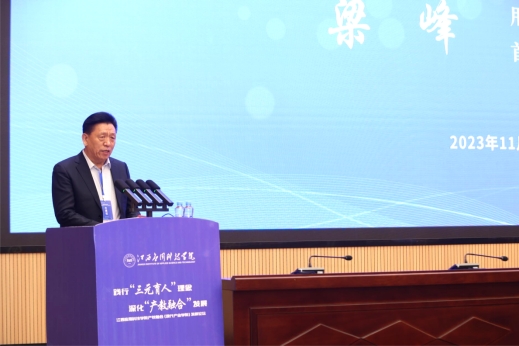 梁峰在致辞中表示,深化产教融合,促进教育链与产业链融合是应用型本科高校发展的必由之路。江西应用科技学院始终贯彻“健全人格+复合专业+实践能力”三元育人的校本理念,将专业学院、产业学院、创新创业学院紧密结合,致力扩大产教融合的广度和深度。