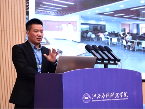 (华为云江西教育行业总监陈乐平正在分享校企合作工作经验)