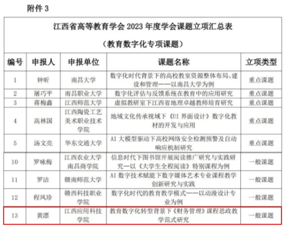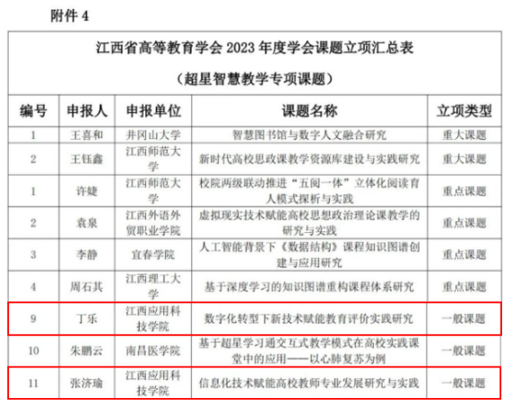 近日,江西省高等教育学会公布了2023年度立项课题名单。我校在前期获悉课题申报通知后,积极组织教师申报,最终有4项课题成功立项。