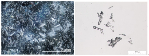 图2范光钼矿的标本(蓝钼矿基质中灰白色片状范光钼矿晶体)及范光钼矿单晶体显微镜图像