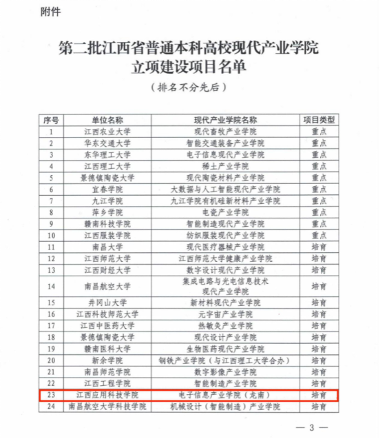近日,江西省教育厅发布《关于第二批江西省普通本科高校现代产业学院立项建设项目名单的通知》,由江西应用科技学院与龙南市人民政府、龙南经开区管委会、龙南骏亚电子科技有限公司、江西志浩电子科技有限公司、赣州前海数贸科技发展有限公司、格力电器(赣州)有限责任公司等成立的“电子信息产业学院(龙南)”入选第二批普通本科高校现代产业学院立项建设培育项目。此次成功入选,标志着我校在产教融合、校企协同培育高层次人才的发展战略中取得新突破。
