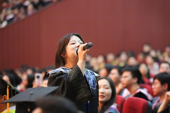 毕业生代表陶思怡同学发言。她分享了自己的军旅生活,并抒发了即将离校的不舍之情。