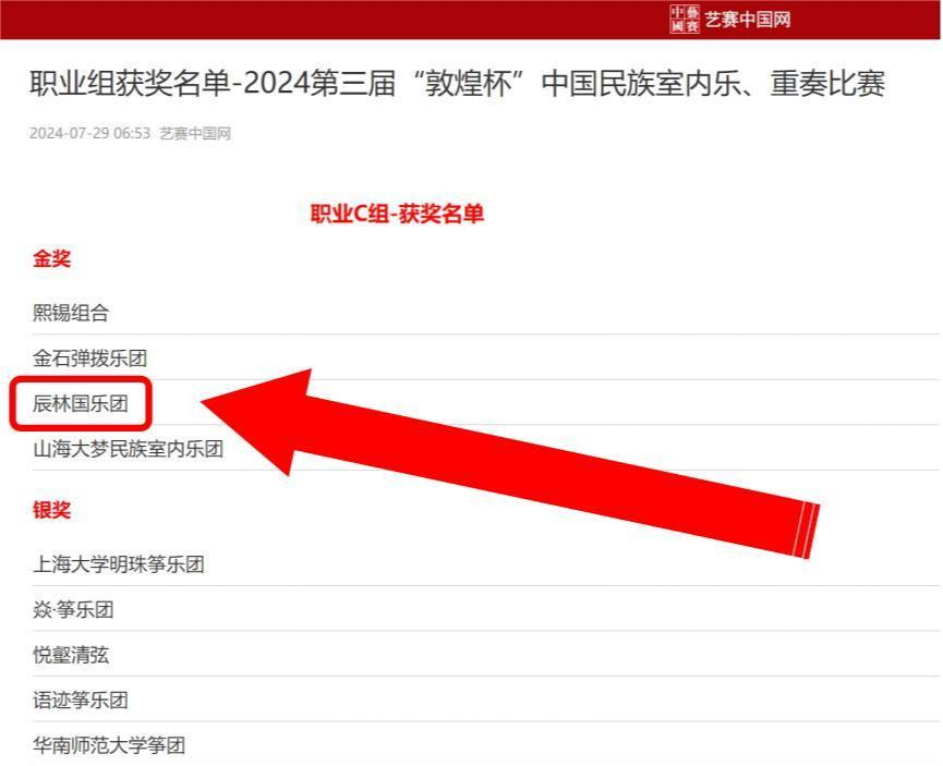 “敦煌杯”中国民族器乐系列展演(比赛)是一个旨在积极弘扬民族音乐文化、为优秀民族音乐学子努力搭建国际化展示交流平台的文化活动品牌,已经连续成功举办了十五年赛事活动,第三届“敦煌杯”中国民族室内乐、重奏比赛,是“敦煌杯”系列赛事项目之一,每三年举办一届。在本次比赛中,有近200支国内优秀的职业和非职业民族室内乐乐团、重奏组合入围并参加决赛,近四十位海内外著名作曲家、指挥家、演奏家、教育家评委参与现场评审。辰林国乐团的成员们以极具感染力的演奏获得了此次比赛的职业组金奖。