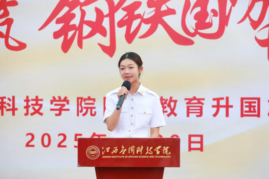 退役大学生、商学院23本商务英语5班学生罗雅婷作了国旗下演讲。她结合五年军旅生涯与“赣青赴疆”社会实践经历,分享了从迷彩绿到青年红的成长感悟。她谈到,部队的锤炼让她深刻体会到恪尽职守、忠诚担当是军人最朴素的信仰;深入新疆的实践,则让她在民族团结一线读懂了家国大义。从沙海老兵的坚守到校园师长的教诲,她认识到个人成长始终与强国征程紧密相连。最后,她号召同学们以青春热血践行忠诚誓言,用挺膺担当谱写新时代的青春战歌。