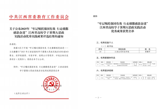 近日,中共江西省委教育工委公布2025年“牢记嘱托强国有我 行走赣鄱感恩奋进”江西省高校学子暑期大思政实践活动优秀成果评选结果。我校教育学院党总支副书记贾鹏军获“优秀实践个人”称号;商学院选送的《赣商精神:从寻根探源到赋能未来,一堂穿越时空的传承课》获优秀新媒体作品三等奖;艺术设计学院选送的《窑火照初心!“瓷韵新创”实践团以“学讲研践”解锁千年瓷都的思政密码》获优秀宣讲视频三等奖。
