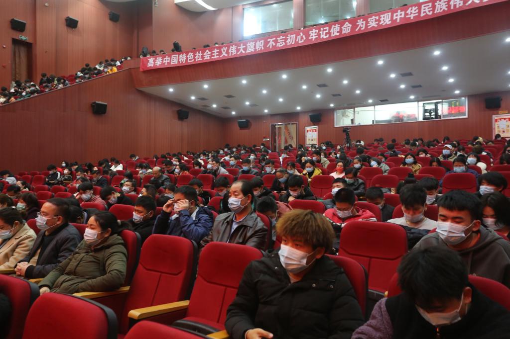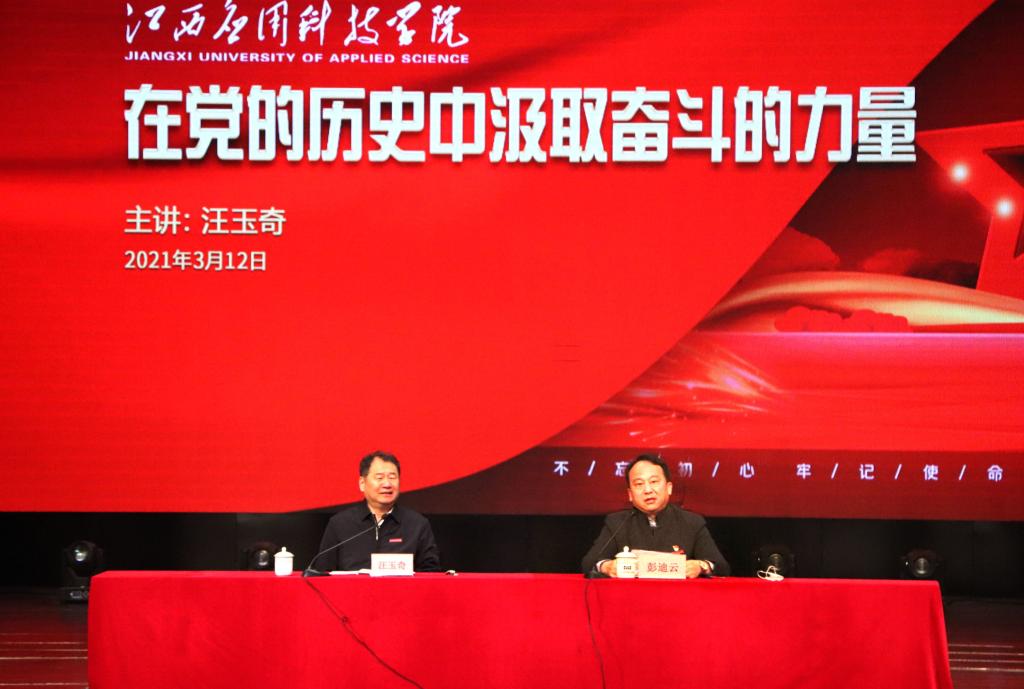 本网讯(记者团记者/易雨梦 摄影/黄愈)3月12日下午,江西应用科技学院2021年春季学期“开学第一课”在音乐厅举行。学校党委书记彭迪云主持报告会并讲话,副董事长、二级研究员汪玉奇以“在党的历史中汲取奋斗力量”为题,线上线下同步开讲“开学第一课”,千余名师生现场聆听报告。