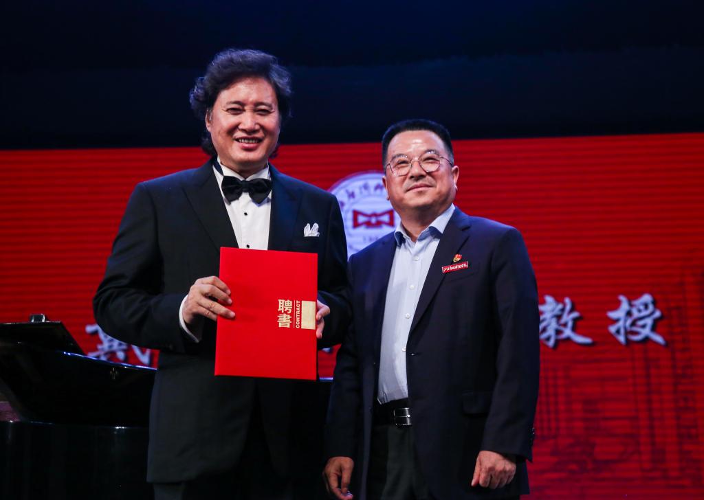 音乐会上,黄玉林教授为著名男高音歌唱家戴玉强颁发“特聘教授”证书,为指挥家孙毅、钢琴演奏家高梅颁发“客座教授”证书。
