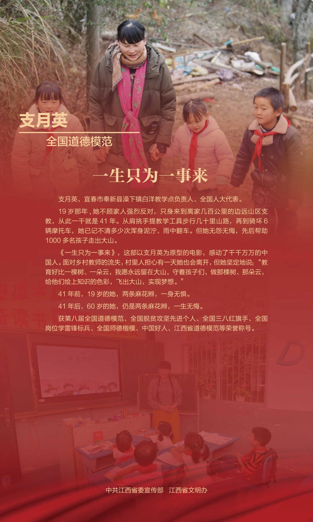 1980年,年仅19岁的支月英不顾家里强烈反对,只身来到离家几百公里的边远山区支教,从此,一干就是41年。从肩挑手提教学工具步行20里山路、再到一个人骑坏6辆摩托车,她已记不清多少次浑身泥泞、雨中翻车,但为了孩子们,她无怨无悔。支月英先后帮助1000多名孩子走出大山,可无论孩子们走的多远,她却一直守在原地,不曾离开。她常说:“不是因为有希望才选择在山里坚守,而是因为坚守才能看到希望,我的一生就为了守护孩子们的梦想而来!”以支月英为原型的电影《一生只为一事来》感动了千千万万的中国人。