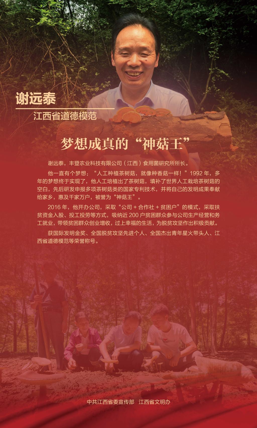 2016年,谢远泰带领弟弟组建了江西省利财食用菌有限公司,采取“公司+合作社+贫困户”的模式,与164户建档立卡贫困户签订了帮扶协议书,引导贫困群众采取扶贫资金入股、投工投劳等方式参与公司生产经营和务工就业,带动贫困群众脱贫增收。