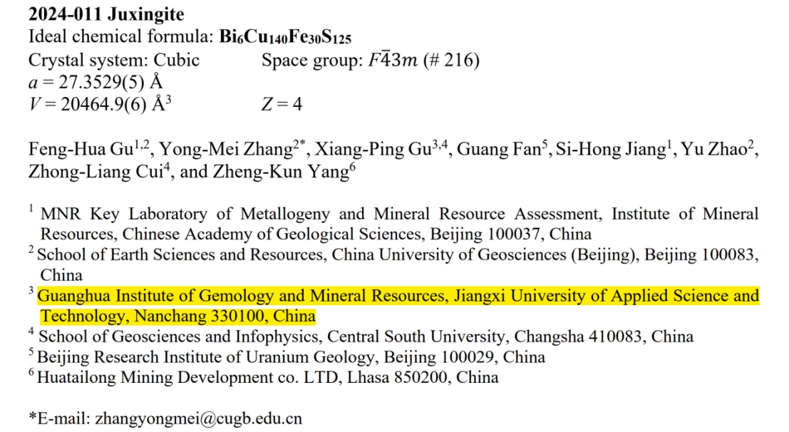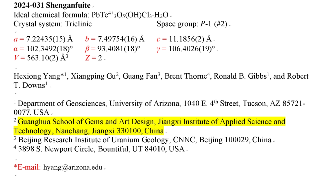 2024年,江西应用科技学院教育科研事业取得重大突破,学校宝石矿物资源学院发现的四个新矿物,连续获得国际矿物协会新矿物命名与分类委员会(IMA-CNMNC)评委会通过。这是学校董事长黄玉林依托江西优良地质资源,创立宝石矿物资源学院,持续加大科研投入,紧盯国际前沿科技,积极研究新能源、新材料取得的又一重大科研成果。这一重大科研成果迅速引起国内外同行的广泛关注,为我国民办大学如何进行基础科学研究、推进应用型人才培养与发展社会科普服务做出了贡献,树立了样板!