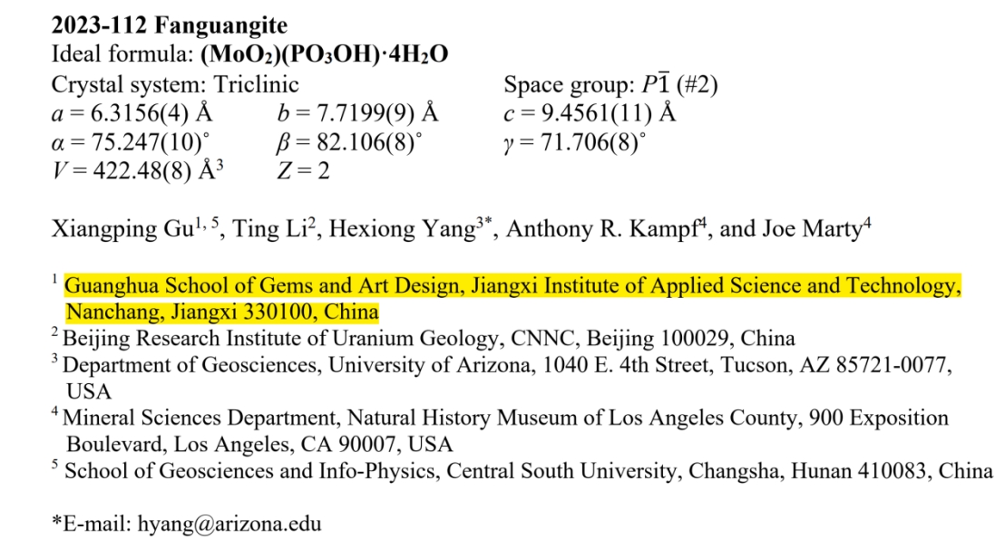 2024年3月2日,国际矿物协会新矿物命名与分类委员会(IMA-CNMNC)宣布:由江西应用科技学院教授谷湘平博士、美国亚利桑那大学研究员与江西应用科技学院兼职教授(顾问)杨和雄博士及核工业地质研究院李婷博士联合研究、申报的新矿物范光钼矿(Fanguangite,批准号IMA-2023-112),获得全票通过,这既反映了江西应用科技学院的科学发现潜力,也是对著名矿物学家范光研究员的崇高致敬,更是中国矿物学家对矿物科学的贡献。
