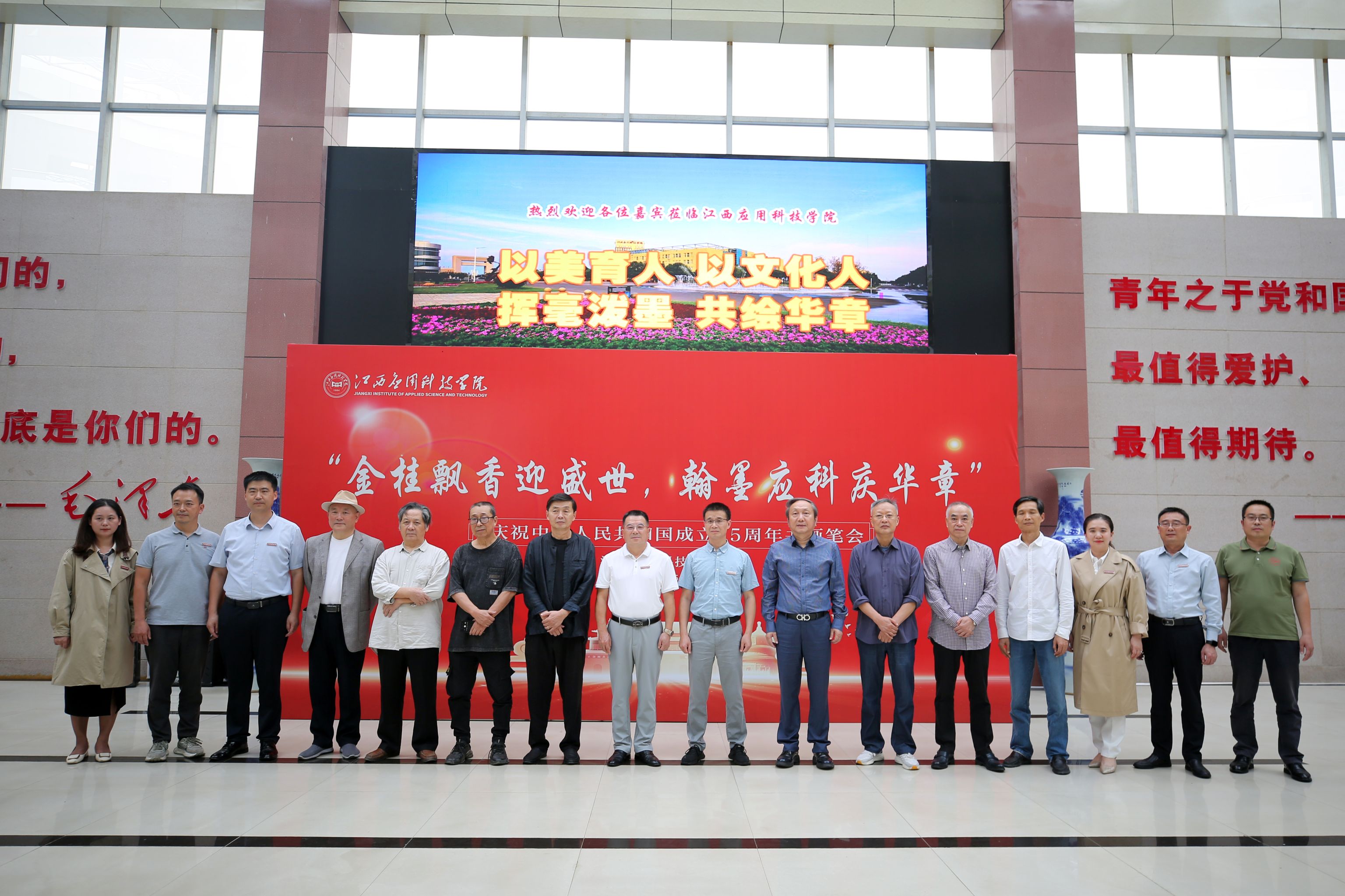 翰墨飘香,群贤汇聚。10月15日,“金桂飘香迎盛世,翰墨应科庆华章”--庆祝中华人民共和国成立75周年书画笔会在我校图书馆一楼大厅举行。江西应用科技学院理事长黄玉林,党委书记、政府督导专员贺一松,全国高校美育教学指导委员会委员、二级教授、江西科技师范大学原美术学院院长支林,常务副校长干甜及社会各界艺术家出席活动,活动由党委副书记、纪委书记江星主持。