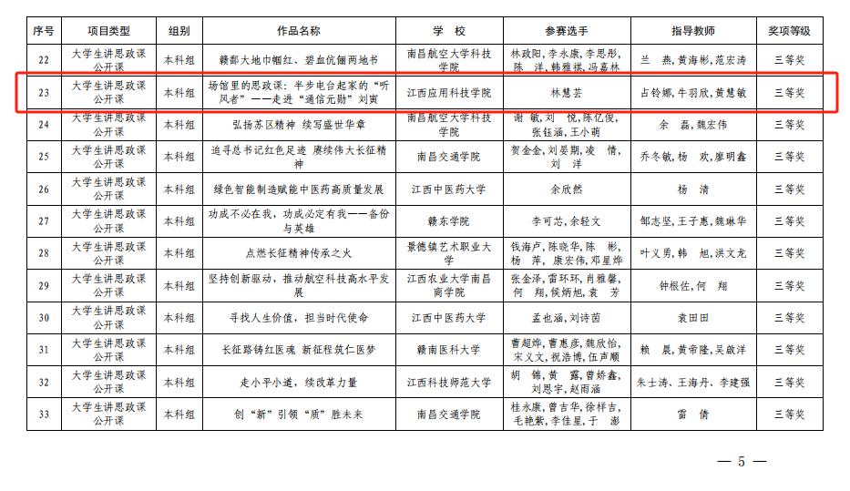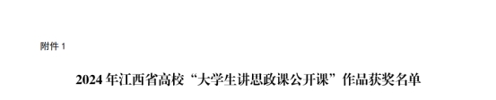 近日,江西省教育厅公布习近平新时代中国特色社会主义思想大学习领航计划主题教育活动评选结果,我校推荐马克思主义学院的两项作品分别荣获2024年江西省高校“大学生讲思政课公开课”作品本科组二等奖和三等奖。