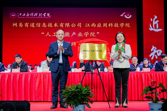 网易有道信息技术有限公司副总裁何皓瑜与江西应用科技学院副校长谢远健共同为学校新获批的共建“人工智能产业学院”揭牌。