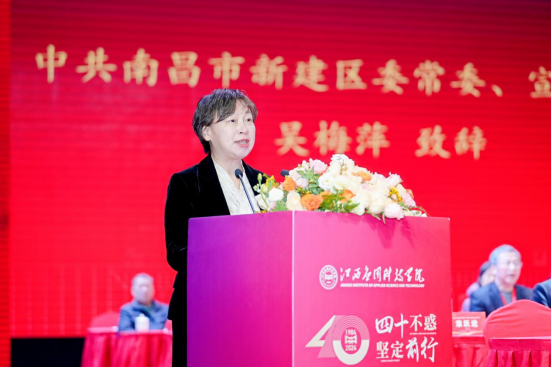 南昌市新建区区委常委、宣传部部长吴梅萍致辞。她代表新建区区委、区政府向学校师生及校友致以祝贺,并感谢各界的支持。她表示,学校自高考补习班起,逐步发展为应用型本科高校,凭着具有鲜明特色和显著优势的应用型人才培养,为地方输送了大量人才。她希望以办学40周年为新起点再创辉煌,全面推动学校高质量发展;希望教师继续潜心教书育人,做有信念、有道德情操、有扎实学识、有仁爱之心的好老师;希望应科学子不负韶华、脚踏实地、勤奋学习,立志做有理想、敢担当、能吃苦、肯奋斗的新时代好青年;希望校友们常回来看看,携手探索发展机遇,创新创业,成就人生。