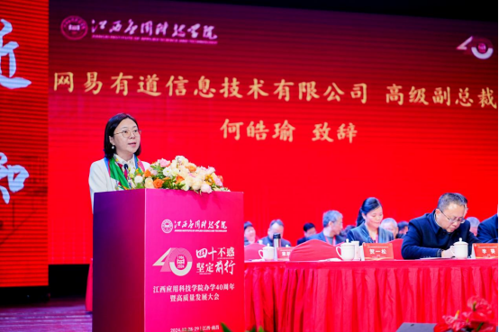 网易有道信息技术有限公司副总裁何皓瑜代表企业界致辞。她表示,网易将协助学校持续产出教学成果和实训成果,以实践为导向,提升教育质量。同时,网易引入学业就业规划体系,提升学生的职业素养和能力,实现高质量就业。