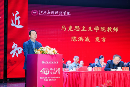 我校教师代表陈洪波老师发言。他回忆了个人与学校的成长历程,40年的春华秋实、薪火相传。作为一线教师,他将以最饱满的精神状态、最积极的工作热情投身到教育教学工作中去,让“追求卓越 众志成城”的精神融入每一个应科人的血脉中,为应科院的发展贡献在工作岗位上继续发光发热。