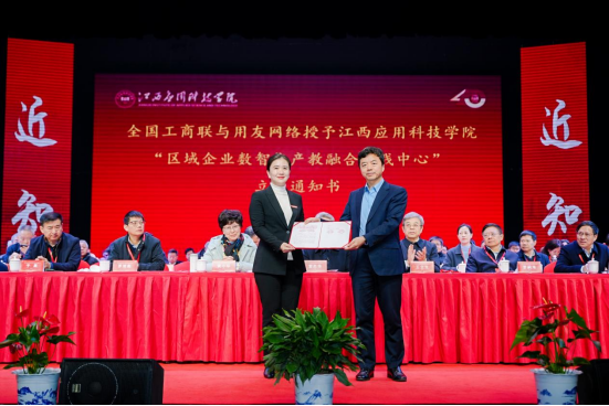 学校获批“区域企业数智化产教融合实践中心”建设资格。我校常务副校长干甜与全国工商联人才交流中心产教融合负责人王晓勃共同登台。王晓勃授予我校立项通知书。