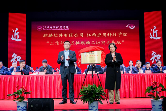 在大会现场,麒麟软件有限公司江西事业部总经理尹英兰与江西应用科技学院副校长张敏共同为学校今年新获批的“工信部第五批麒麟工坊实训基地”揭牌。