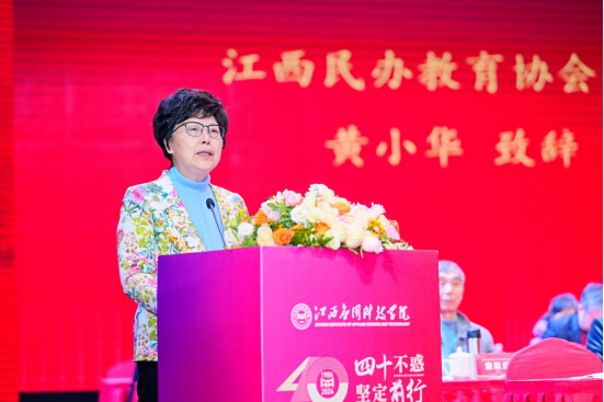 江西民办教育协会会长黄小华致辞。她表示,学院在过去四十年里,秉持“三元育人”校本理念为社会培养了17万多名优秀毕业生,为社会输送了大批应用型人才。学院在促进高等教育大众化、文化建设方面也取得了显著成绩,深受社会各界的好评。她强调,学校站在新的历史起点,要不忘初心、继续前行,继续深化教育改革,提高教育质量和办学水平,培养更多全面发展的优秀人才,为建设教育强省作出新的更大贡献。