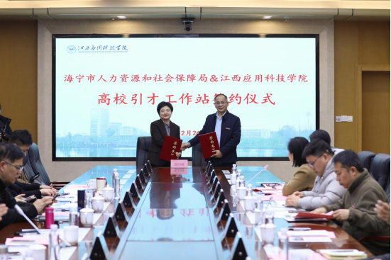 2月26日上午,江西应用科技学院与海宁市人力资源和社会保障局在三元大厦一楼会议室举行人才交流合作座谈会暨引才工作站签约仪式。海宁市人力资源和社会保障局党组成员、副局长沈燕明等人社局领导、浙江汉峘教育发展有限公司总经理李立新等企业代表,江西应用科技学院党委委员、副校长谢远健、招生就业处副处长赵学敏及相关学院党总支书记共同参会。