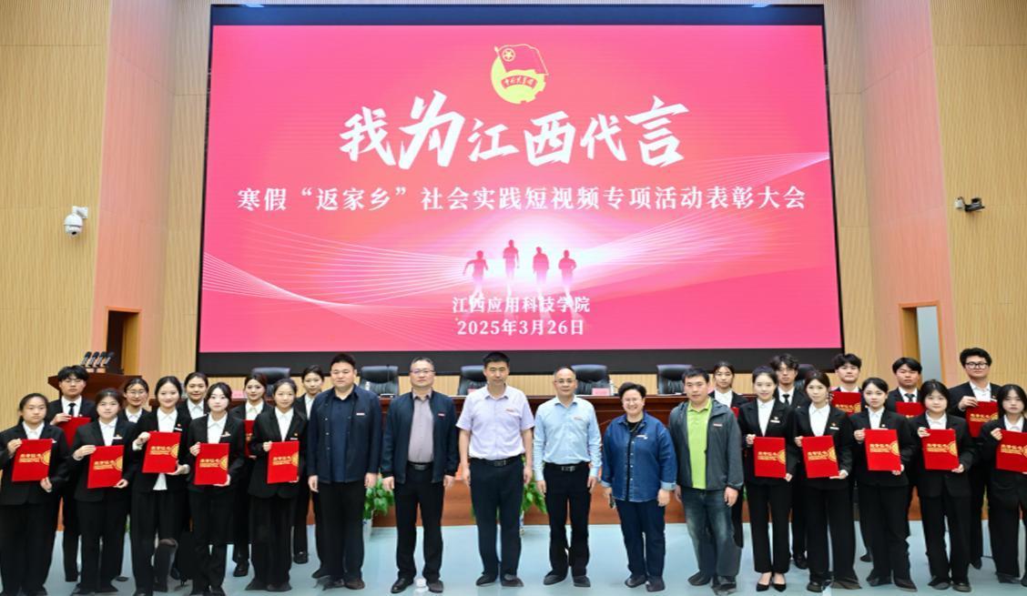 为进一步引领广大青年学子在社会实践中受教育、长才干、作贡献,进一步动员引领青年学生在投身基层建设、服务家乡发展中坚定信念、增长本领、作出贡献,用好用活江西本土资源,加快学校短视频短剧产业学院建设,3月26日下午,江西应用科技学院2025年“我为江西代言”寒假“返家乡”社会实践专项活动表彰大会在三元大厦二楼学术报告厅举行。学校党委副书记、纪委书记江星,党委委员、副校长谢远健出席大会,学校相关职能部门负责人,各二级学院党总支(副)书记、团总支书记,青年学生代表参会。会议由团委书记张荆主持。