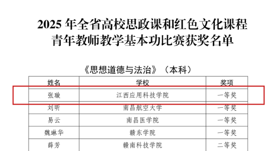 近日,由江西省教育厅主办的2025年全省高校思政课和红色文化课程青年教师教学基本功比赛圆满落幕。经过激烈角逐,我校马克思主义学院张璇老师凭借扎实的教学功底、鲜明的教学风格和出色的课堂表现,荣获《思想道德与法治》本科组一等奖第一名。