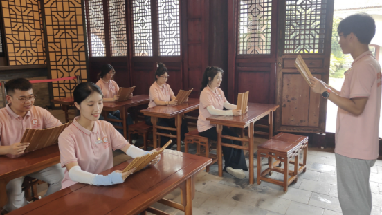在书院文会堂,队员们以《白鹿洞书院揭示》为蓝本,面向当地小学生开设一堂以书院文化为载体的儿童启蒙课程。孩子们在活字印刷、古籍装帧的体验中,近距离感受“慎思笃行”的治学精神,让千年书香在童心中悄然生长。