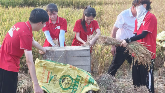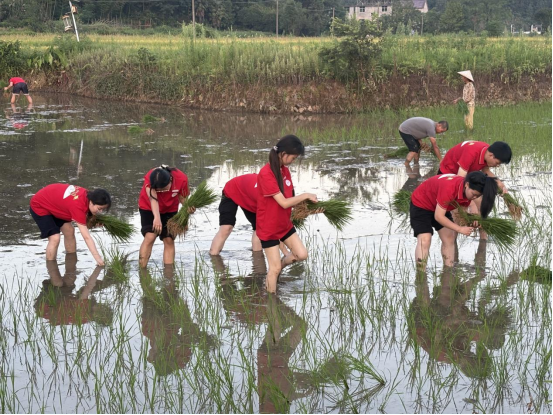 在裴梅镇新时代文明实践所与地方干部的支持下,实践队员走入稻田深处,亲身参与插秧、割稻等传统农事活动。水田微波荡漾,稻苗青翠欲滴,青年们卷起裤脚、弯腰俯身,在泥泞与阳光交织的田畴间,体验着“从泥中生长”的不易,也感受着“粒粒皆辛苦”的真实分量。一双双沾满泥水的手,一行行整齐挺立的秧苗,构成了一幅青春与土地共鸣的动人画面。