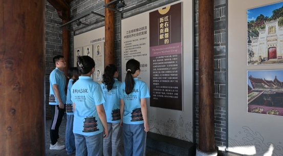 吴城古镇自古商贸繁荣,是明清时期“江西四大名镇”之一。实践队成员登临古码头,恍若看见帆樯林立、商船云集的盛况,切身感受到赣商“勇闯敢拼”的担当魄力。在吴城历史文化博物馆,同学们从“南来北往吴城地”“装卸不尽吴城货”等展区中,深入理解了赣商“厚德实干,义利天下”的精神内核。随着商贸的兴盛,吴城曾先后兴建四十八座同乡会馆,其中全楚会馆、山西会馆、广东会馆、江西会馆等最为著名。这些会馆规模宏大、雕梁画栋,既融汇各地建筑特色,也见证了赣商群体跨地域交流与互助的精神力量。漫步古镇街巷,青石板路上的生活印记和纵横分布的古迹遗存,串联出赣商文化的发展脉络,展现出“贾德兼修、诚信守道”的价值坚守。